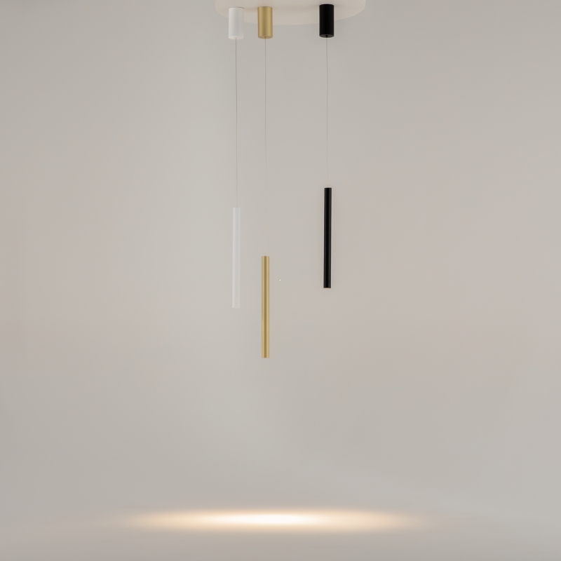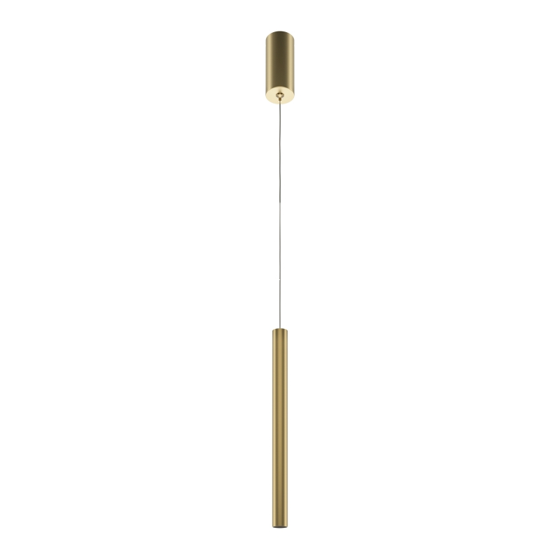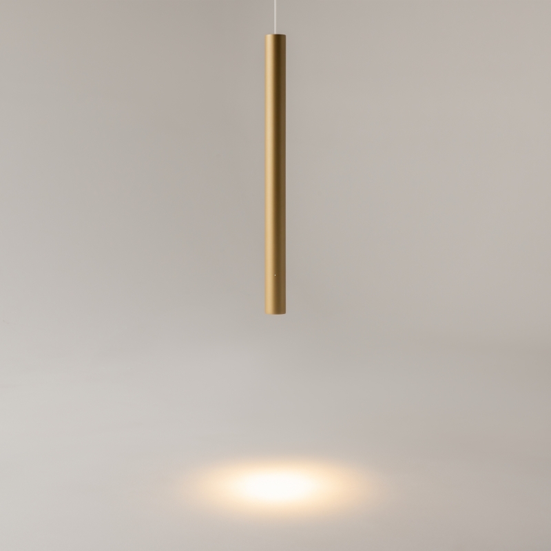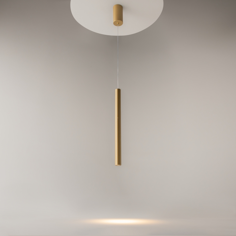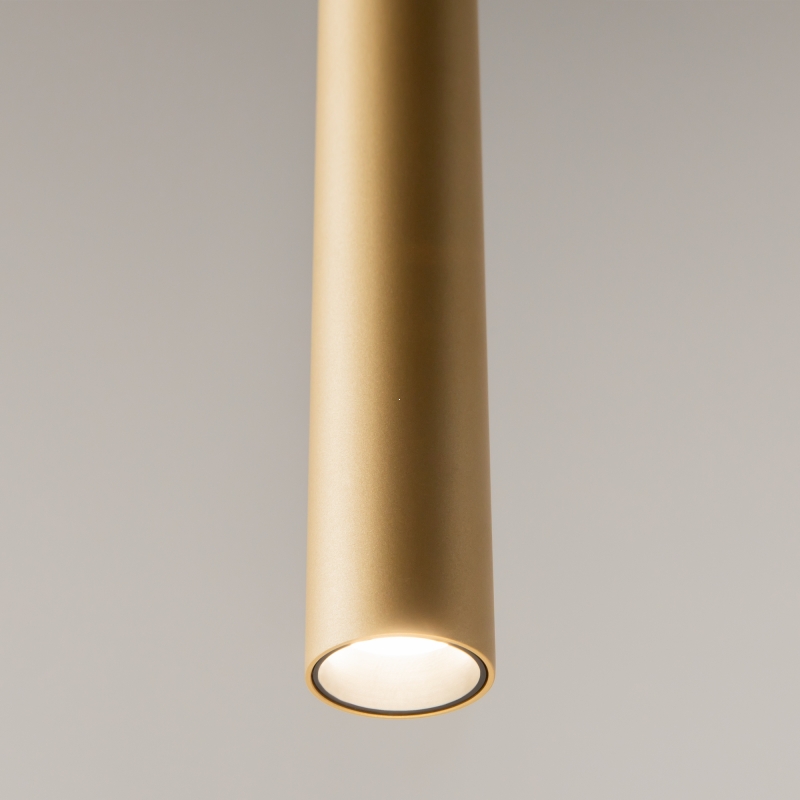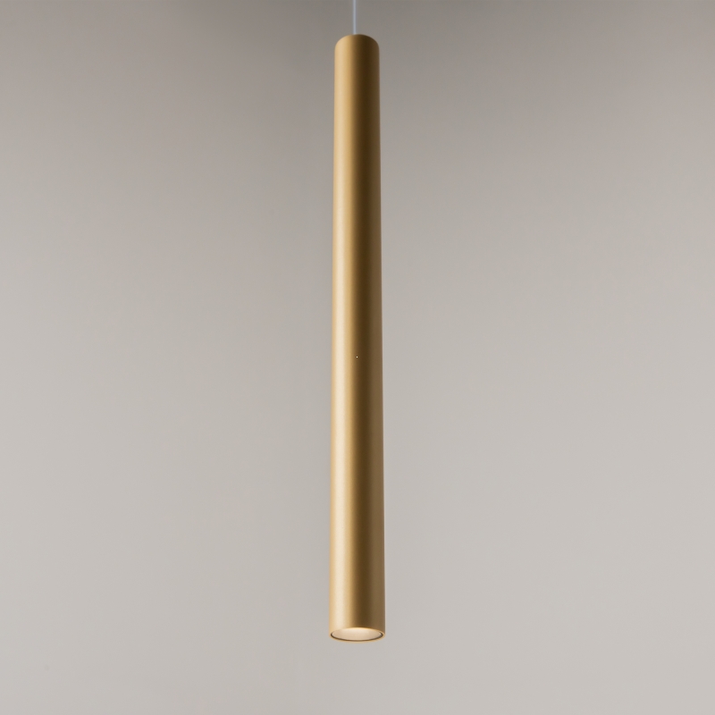Подвесной светильник имеет минималистичную конструкцию с тонкой и стильной формой. Золотой цвет, выполненный из алюминия, придает ему современный вид и делает акцент на утонченности. Его гладкая поверхность и лаконичные линии создают ощущение легкости и воздушности, обеспечивая гармоничное сочетание с любым интерьером.