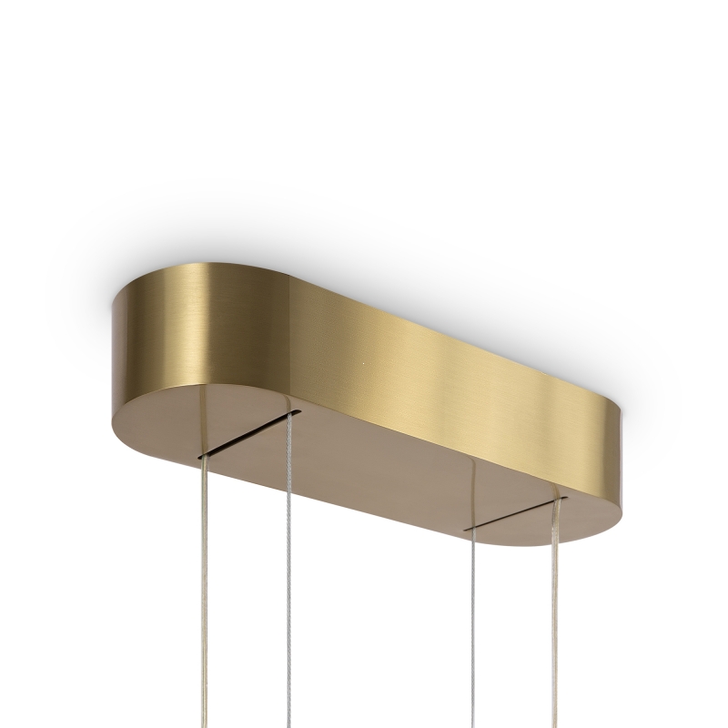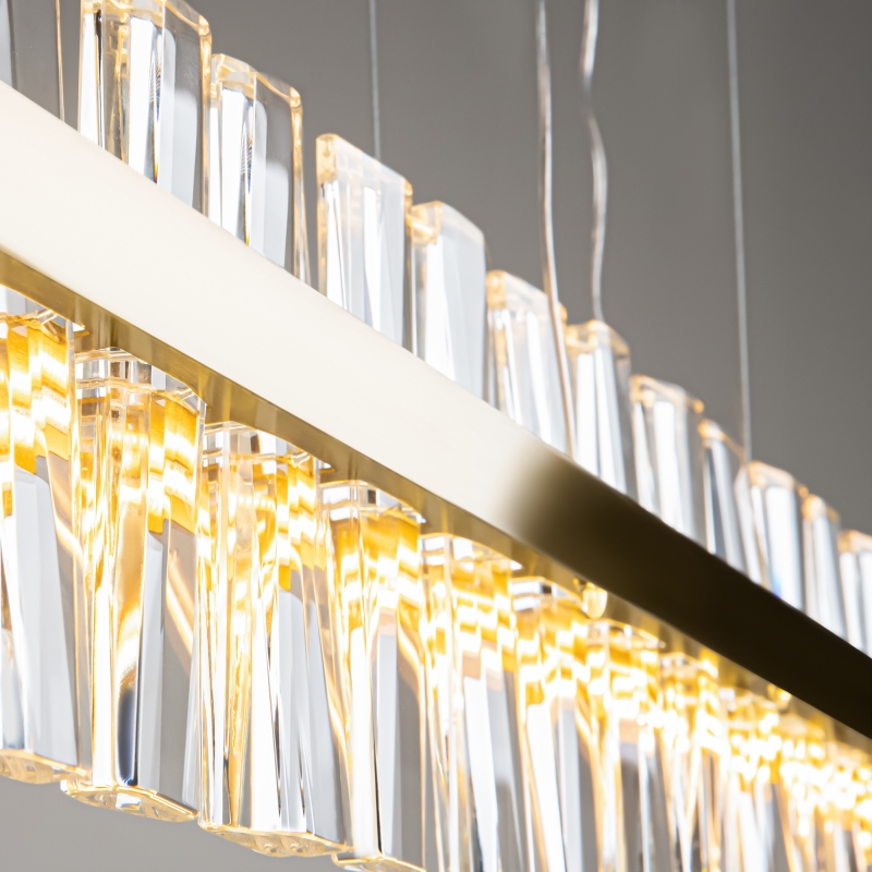 Светильник имеет простой, но в то же время эффектный дизайн, сочетающий в себе современный стиль и классические элементы. Латунный цвет придает ему благородство, а хрустальные элементы добавляют изысканности и переливов света. Длина светильника составляет 110 см, что позволяет использовать его в различных интерьерах, а высота регулирования от 43 до 118 см делает его универсальным для установки в помещениях с разными высотами потолков.