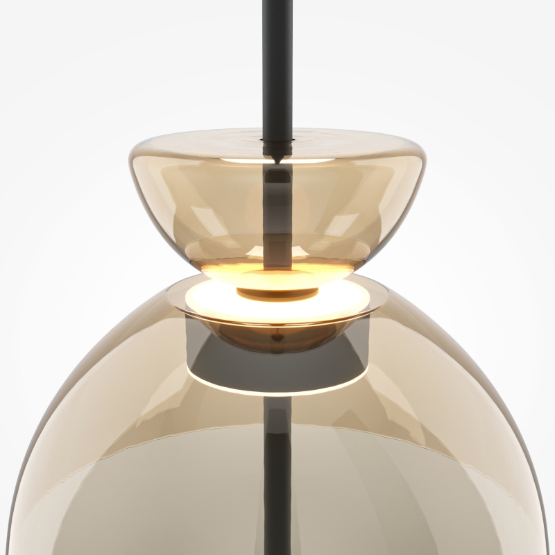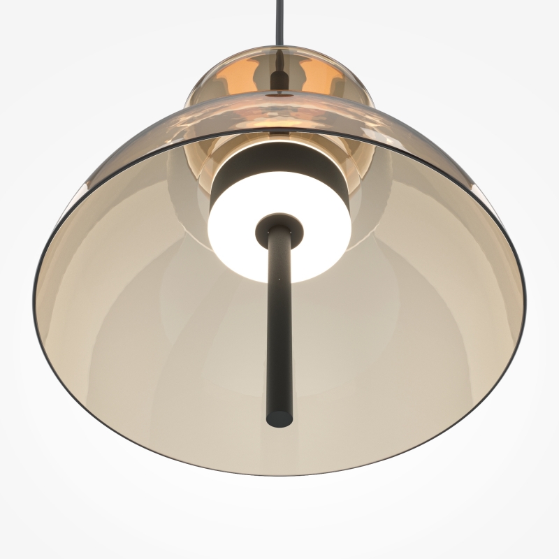 Светильник имеет современную конструкцию с черным металлическим креплением и коньячным стеклянным абажуром. Его минималистичный стиль прекрасно сочетается с различными интерьерами, подчеркивая их индивидуальность. Черный цвет корпуса добавляет строгости, а коньячный абажур создает теплое и мягкое свечение, что делает светильник идеальным акцентом в любом помещении.