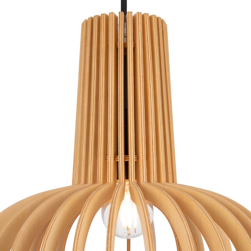 Светильник имеет изысканную конструкцию с плавными линиями, выполнен в черном цвете, что придаёт ему современный вид. Абажур из бежевой фанеры состоит из пяти слоёв, что обеспечивает интересный световой эффект и создает уникальную игру теней. Этот светильник прекрасно впишется в интерьеры в стиле модерн и минимализм, подчеркивая их достоинства.