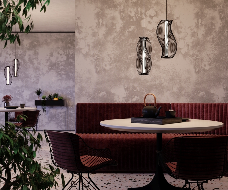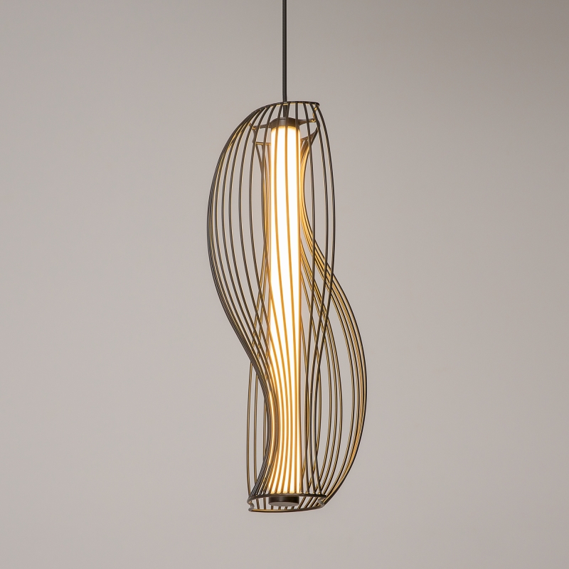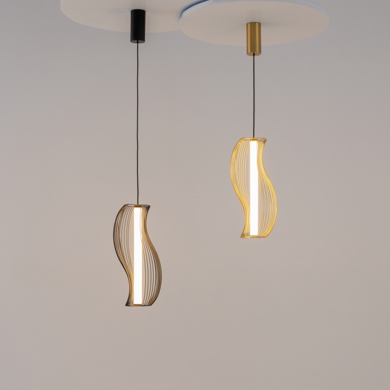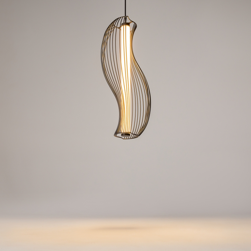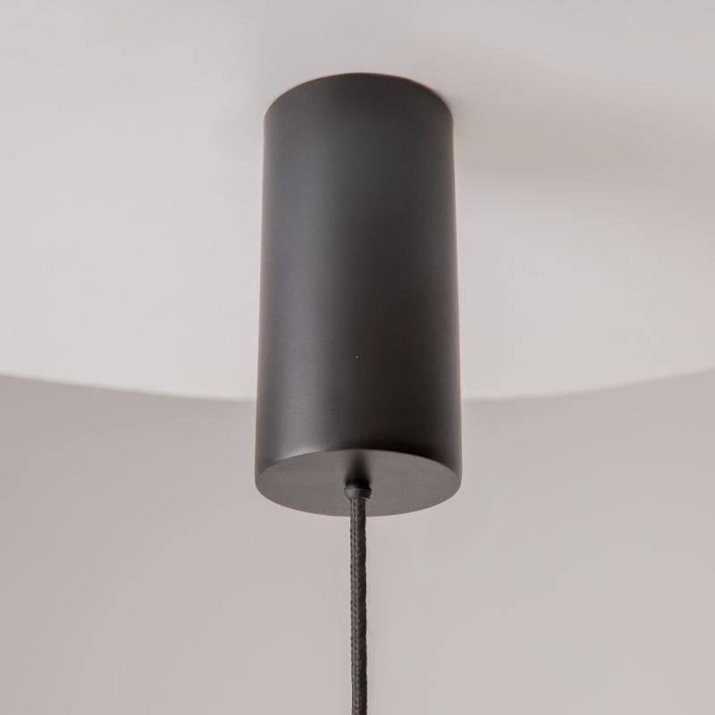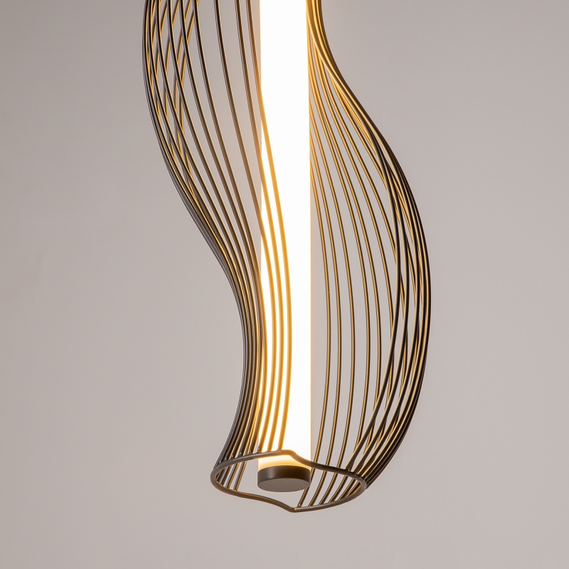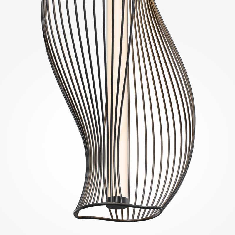 Светильник имеет оригинальную конструкцию с изогнутыми линиями, что придаёт ему динамичность и современность. Черный металлический корпус гармонично сочетается с белым акриловым абажуром, который обеспечивает мягкое и равномерное освещение. Высота светильника регулируется в диапазоне от 520 до 3520 мм, что позволяет адаптировать его под различные потолки. Фактура и детали исполнения подчеркивают высокое качество и внимание к стилю.