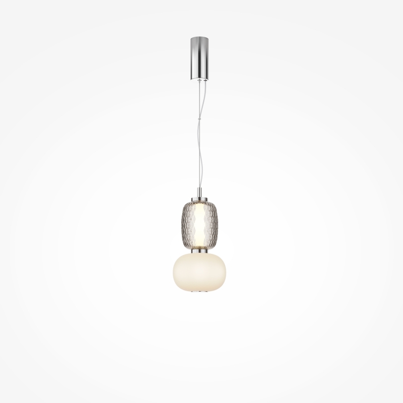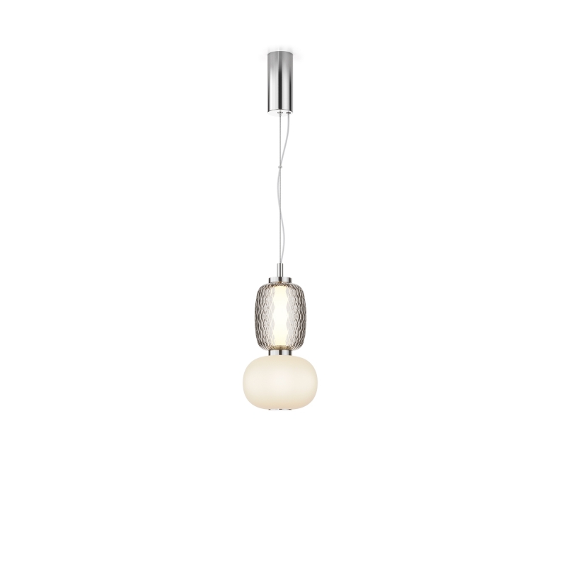 Этот светильник сочетает в себе гармонию округлых и вытянутых форм, выполненных из качественного стекла. Хромированная металлическая арматура подчеркивает современный стиль, а белый и серый абажур создают мягкое рассеянное освещение. Уникальный рельефный рисунок на плафонах добавляет текстурности и изящества, создавая игру света и тени в помещении.