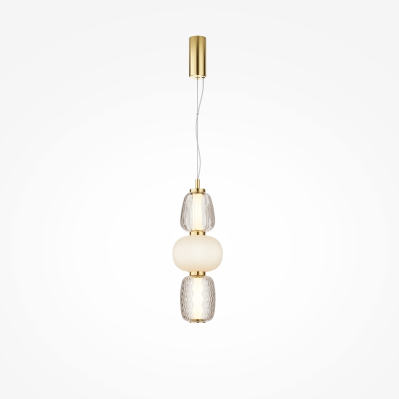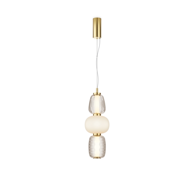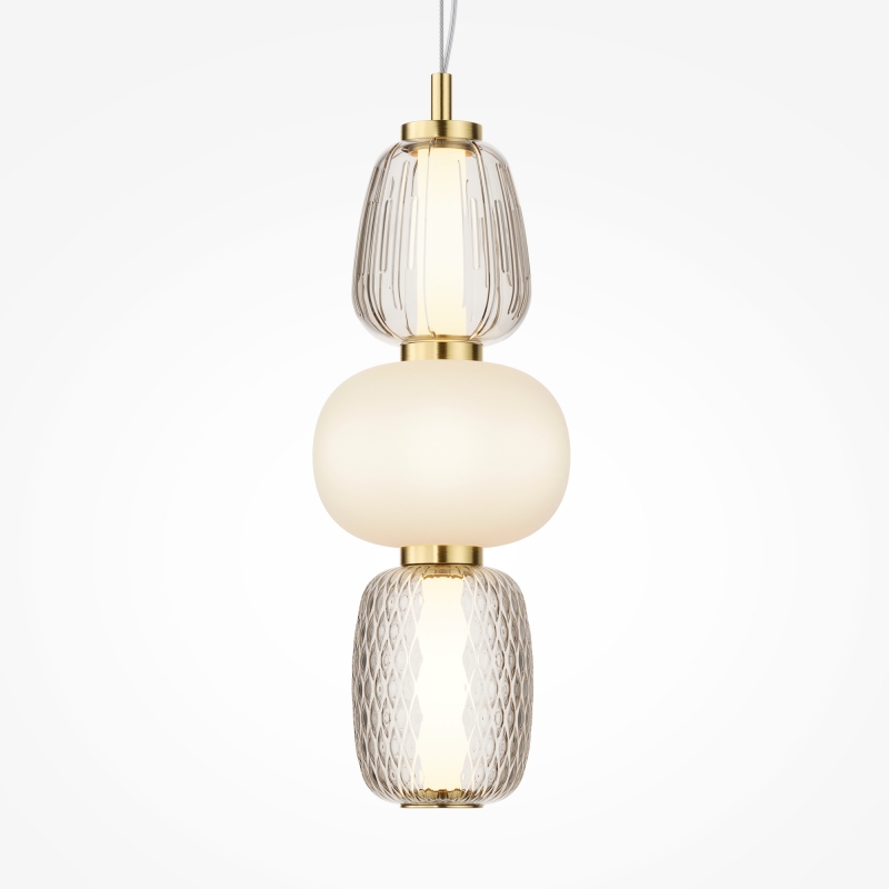 Подвесной светильник имеет изящную конструкцию с тремя плафонами, выполненными из прозрачного и белого стекла. Золотая арматура подчеркивает стиль и элегантность, а разнообразие форм плафонов создает интересный визуальный эффект. Этот светильник идеально впишется в современные интерьеры, добавляя нотку роскоши.