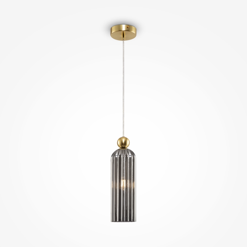 Этот светильник выделяется своей уникальной конструкцией: цилиндрический абажур из стекла с рифленой поверхностью усиливает световые эффекты, создавая неповторимую игру света и тени. Золотая металлическая арматура добавляет роскоши, а серый оттенок абажура гармонично впишется в различные стили интерьера. Светильник прекрасно сочетает в себе современный стиль и элементы классики, что делает его универсальным решением для вашего дома.