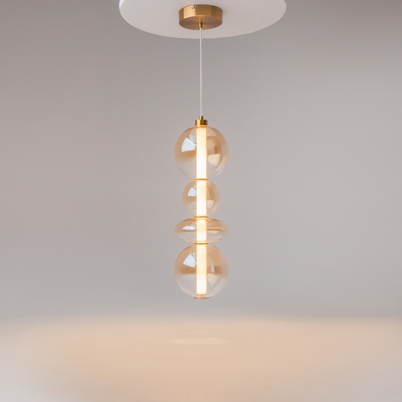 Подвесной светильник Futuro отличается своей элегантной конструкцией и современным стилем. Он выполнен из высококачественного металла с латунным покрытием, что придает ему изысканный вид. Абажур из стекла, окрашенный в янтарный цвет, создает мягкое и теплое освещение, делая пространство более уютным. Форма абажура — сфера, что добавляет гармонии и современности.