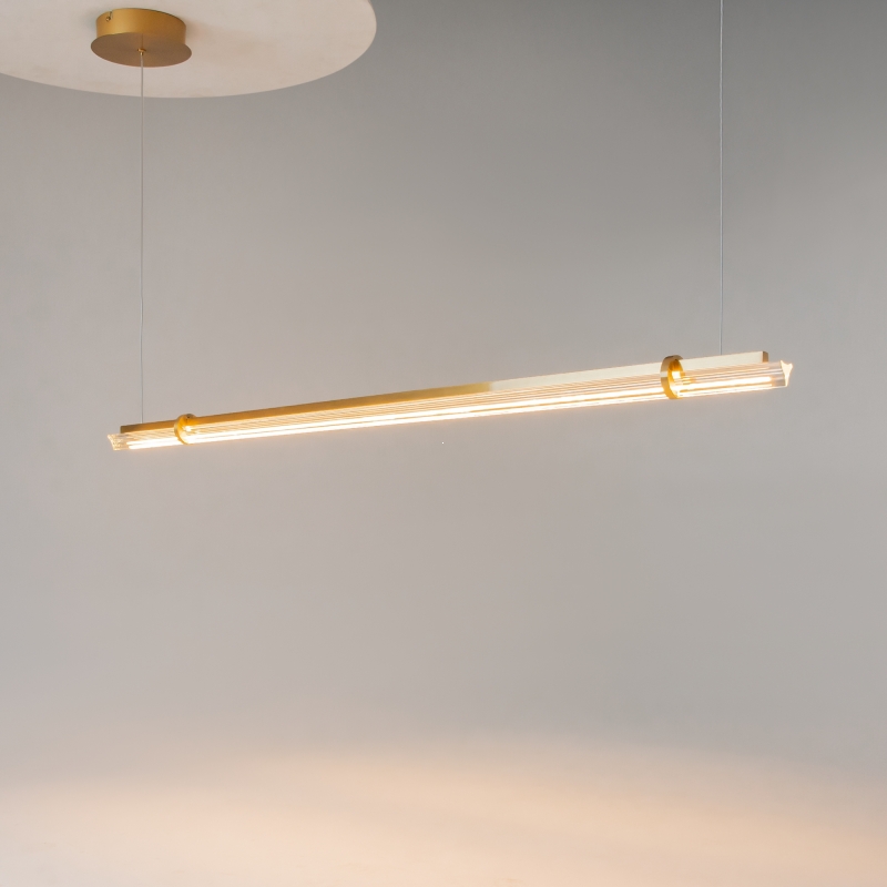 Подвесной светильник имеет изящный и минималистичный дизайн, который легко вписывается в различные интерьеры. Конструкция выполнена из алюминия с латунным покрытием, а плафон из прозрачного стекла придаёт светильнику лёгкость и воздушность. Тонкая форма и плавные линии создают элегантный силуэт, который станет ярким акцентом в вашем пространстве.