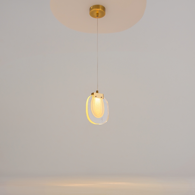 Светильник имеет изысканную конструкцию с прозрачным абажуром, выполненным из стекла, и латунным основанием. Его форма и материалы создают ощущение легкости и утонченности. Прозрачный плафон позволяет свету мягко рассеиваться, наполняя пространство теплым сиянием. Латунный акцент добавляет нотку роскоши и стиля.