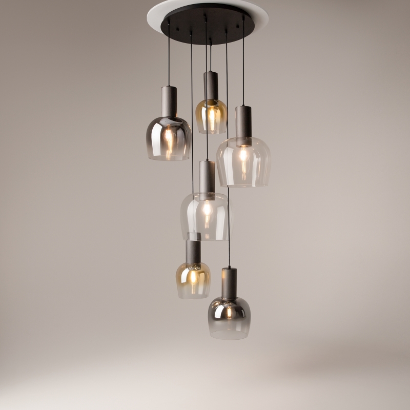Светильник имеет уникальную конструкцию с шестью плафонами, каждый из которых выполнен из стекла и представлен в разнообразных оттенках. Черный алюминиевый каркас подчеркивает современный стиль, а разноцветные абажуры создают интересный визуальный эффект. Нестандартная форма плафонов добавляет динамики и делает светильник настоящей изюминкой вашего пространства.