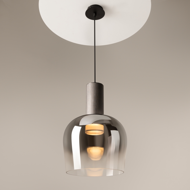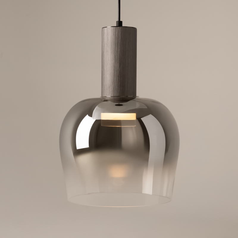 Светильник обладает лаконичной формой с плавными линиями, что делает его универсальным дополнением к различным стилям. Стеклянный абажур с дымчатым эффектом создает мягкое и комфортное освещение, а металлическое основание добавляет современный акцент. Благодаря своей конструкции и фактуре, он привлекает внимание и подчеркивает изысканный вкус владельца.