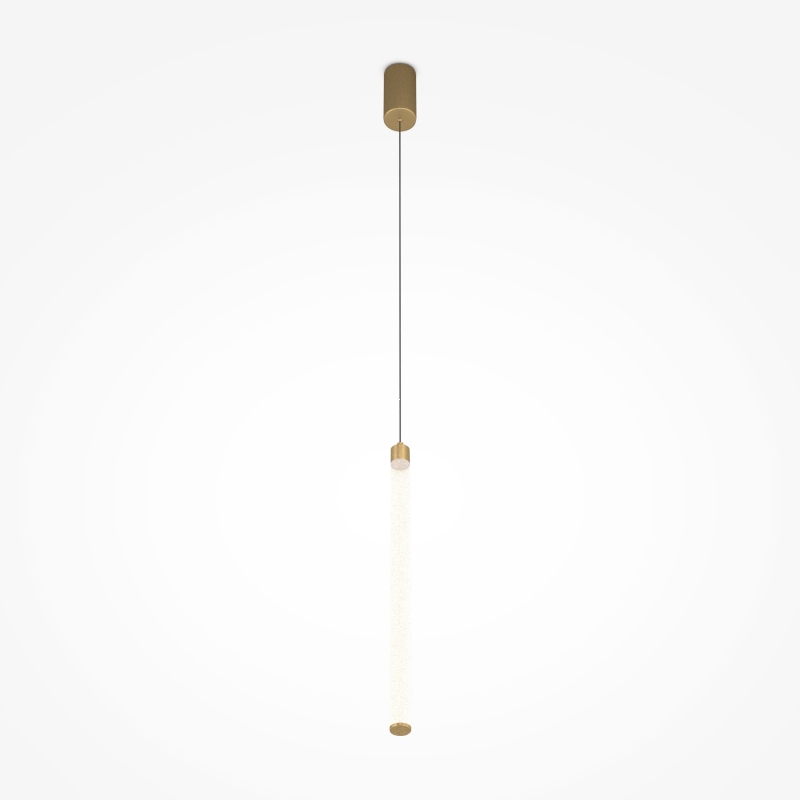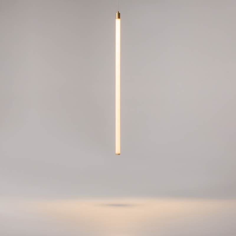 Светильник обладает минималистичным и современным дизайном. Его цилиндрическая форма и золотой цвет придают ему особую изысканность. Материал корпуса - алюминий и акрил, что обеспечивает не только стильный внешний вид, но и долговечность. Легкий и изящный провод позволяет регулировать высоту светильника, что дает возможность адаптировать его под любые условия.