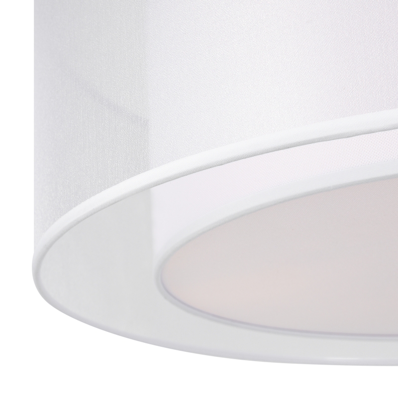 Светильник представляет собой изысканную конструкцию в форме барабана, выполненную в нежном белом цвете. Материал — текстиль, который придаёт изделию мягкость и теплоту. Прозрачный абажур добавляет лёгкости, а металлические элементы подчеркивают современный стиль. Общая форма и отделка создают ощущение утонченности и стиля, что делает светильник отличным акцентом в любом интерьере.
