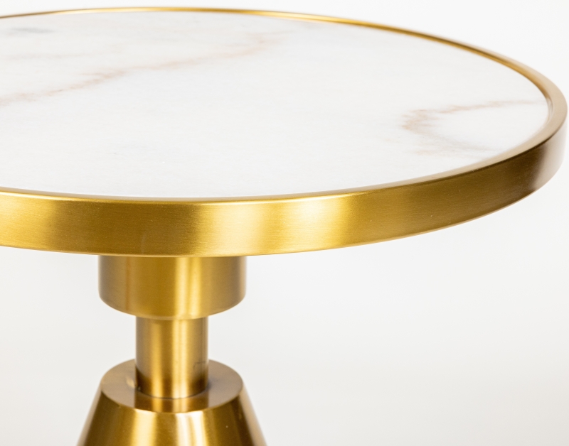 Столешница выполнена из белого мрамора, который добавляет нотки роскоши, а основание из золотого металла с полированной поверхностью создаёт эффектный контраст, подчеркивая изысканность.