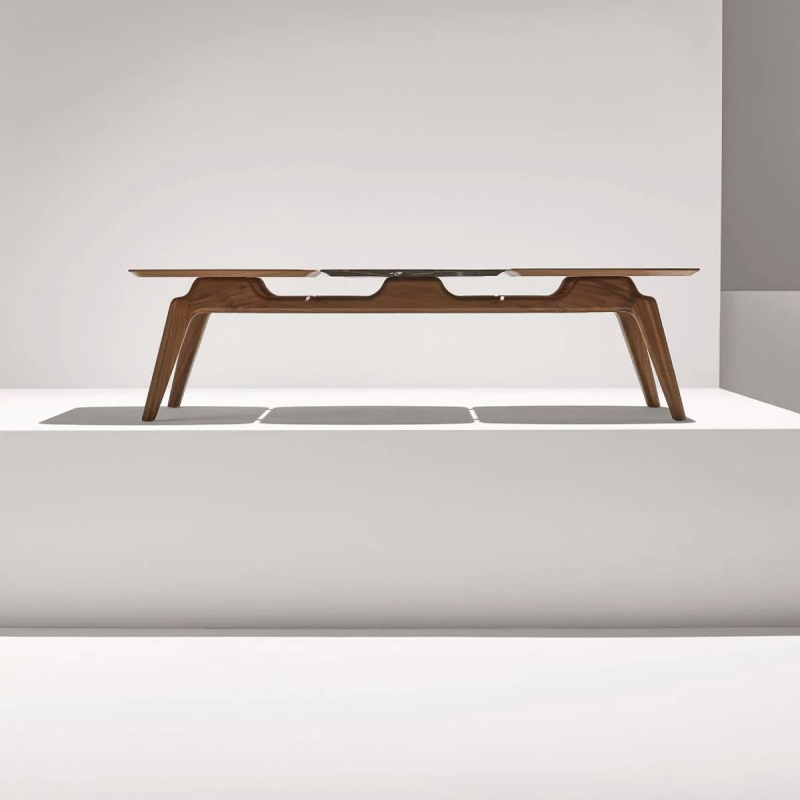 Столешница выполнена из натурального дерева ореха, которое прекрасно гармонирует с роскошным золотом Calacatta и мрамором Sahara Noir. Видна натуральная текстура дерева, а мраморная отделка придает столу уникальность.