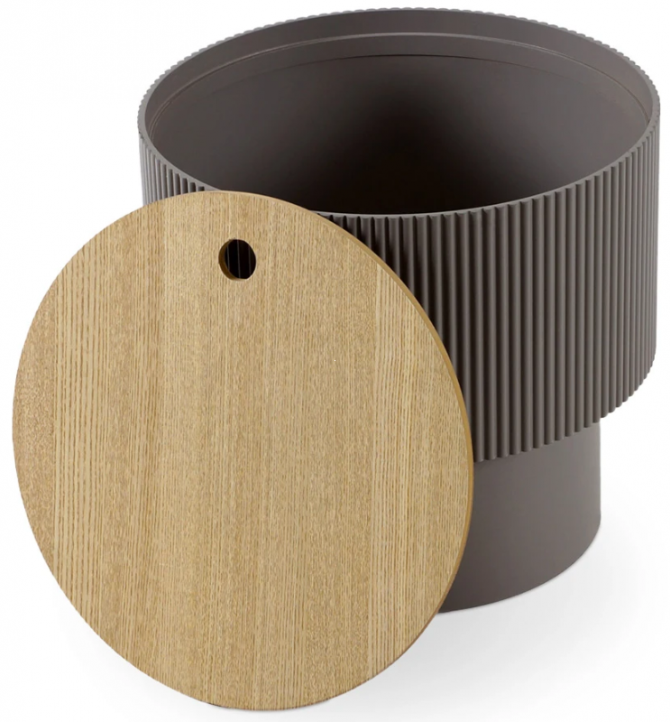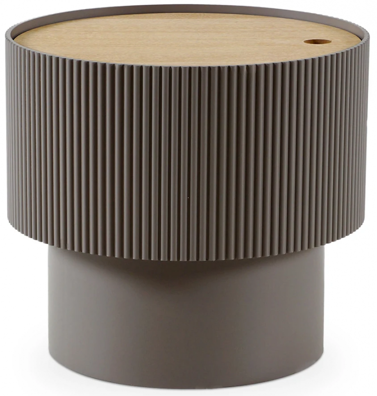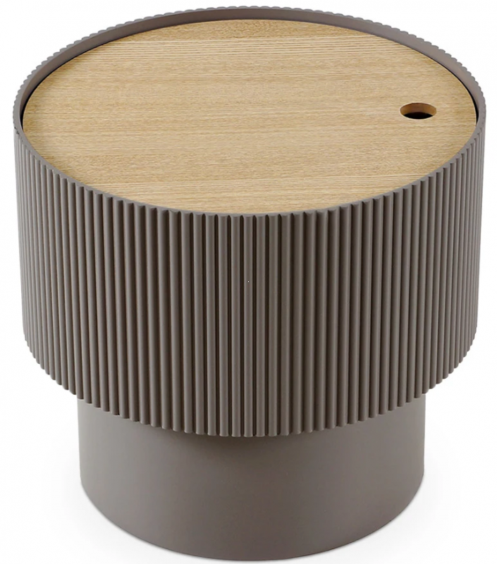 Столик Imono представляет собой гармоничное сочетание круглой столешницы и цилиндрического основания, которое расширяется к верхней части. Столешница выполнена из натурального ясеневого шпона с красивым естественным рисунком, а основание — из прочного МДФ. Главная особенность — это гофрированная текстура, которая добавляет объема и фактуры, создавая эффект динамики и движения. Цветовая гамма в теплых нейтральных тонах делает столик универсальным, легко вписывающимся в любые интерьеры.