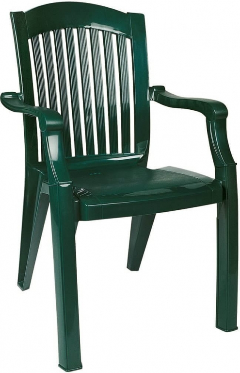 Сдержанный тёмно-зелёный стул с подлокотниками создаёт ощущение ухоженной террасы и спокойного отдыха на свежем воздухе. Этот пластиковый садовый стул идеально подойдет для дачи, веранды или зоны уличного обеда и поможет создать атмосферу уюта и порядка.