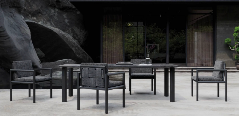 Стол Eclat Nightfall – это стильный прямоугольный стол с современным дизайном, который привлекает внимание своей лаконичностью. Столешница, выполненная из спеченного камня, придаёт ему неповторимую текстуру и прочность. Алюминиевый каркас с порошковым покрытием обеспечивает устойчивость к коррозии и внешним воздействиям, что делает его идеальным для использования на улице. Цветовая гамма в серых и черных тонах создаёт гармонию с любым окружением, а детализированные грани столешницы добавляют изысканности.
