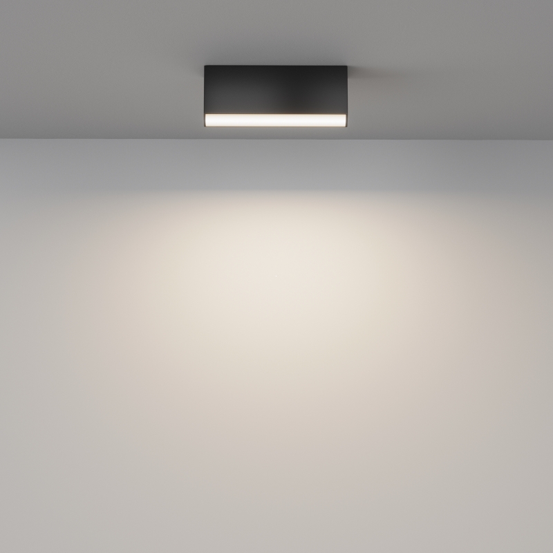 Светильник имеет прямоугольную форму с четкими линиями, что подчеркивает его современный дизайн. Выполнен в элегантном черном цвете и изготовлен из качественного алюминия, что придает изделию прочность и долговечность. Его лаконичный вид делает его универсальным решением для любого помещения.