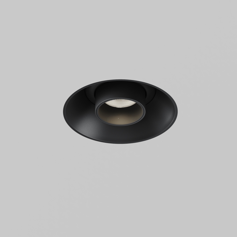 Светильник выполнен в элегантном черном цвете, что позволяет ему легко вписаться в любые современные интерьеры. Конструкция имеет компактные размеры, что делает его идеальным для встраивания в потолок. Округлая форма и минималистичный стиль акцентируют внимание на качестве исполнения и высоких материалах, таких как алюминий, что обеспечивает долговечность и надежность.