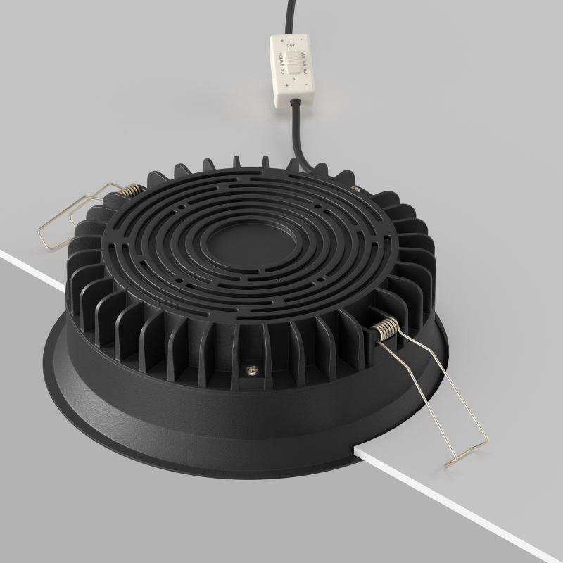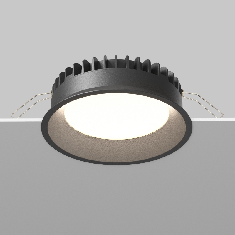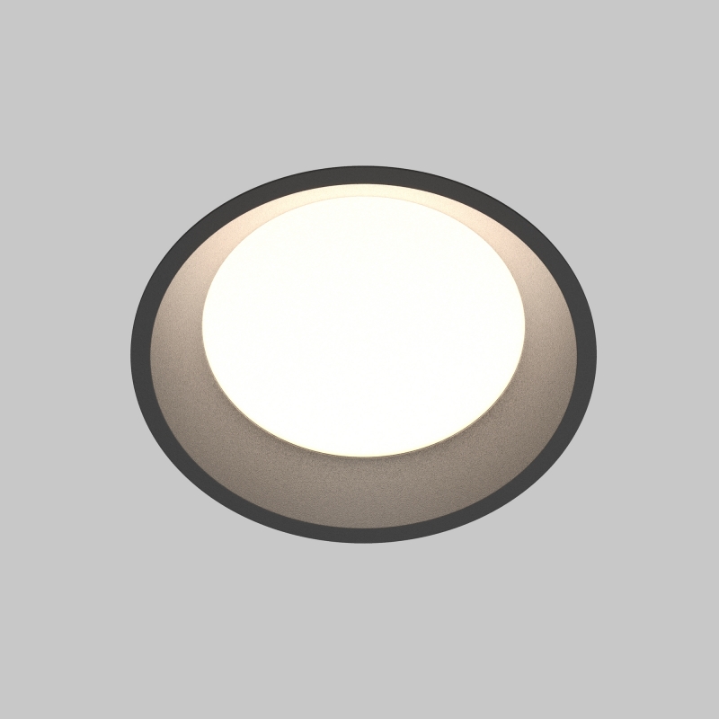 Светильник выполнен в современном черном цвете, что придаёт ему стильный и минималистичный вид. Круглая форма и утопленный матовый рассеиватель обеспечивают аккуратное вписывание в потолок, не создавая визуального нагромождения. Конструкция сочетает в себе алюминий и пластик, что делает его легким и прочным.
