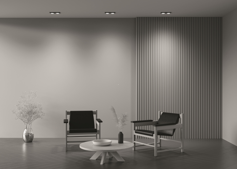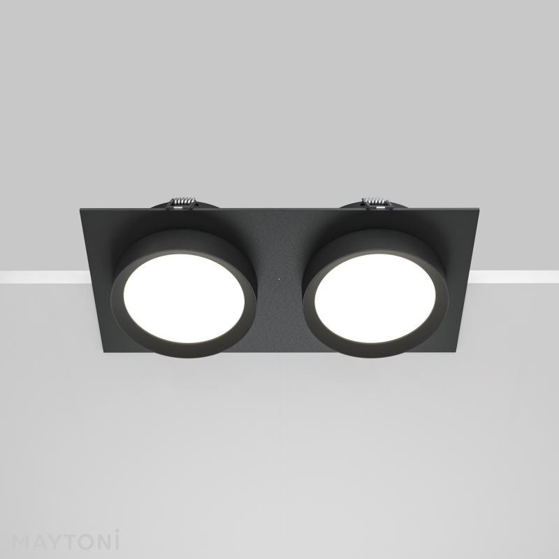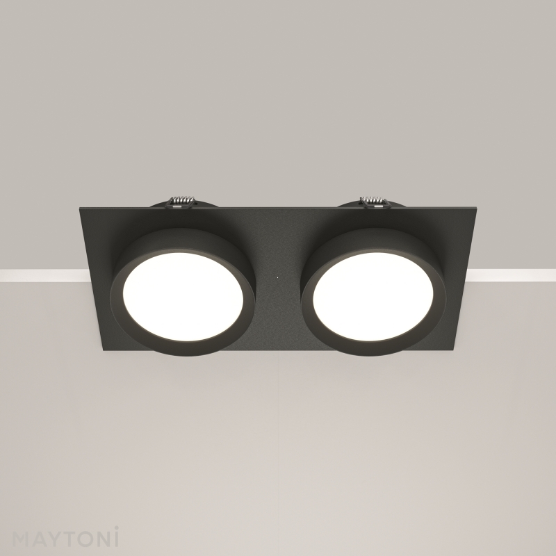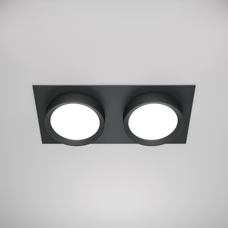 Светильник выполнен в лаконичном черном цвете, который придаёт ему универсальность и современность. Конструкция с двумя круглыми плафонами и прямоугольной основой выглядит стильно и минималистично, идеально вписываясь в различные интерьерные решения. Материал — сочетание алюминия и пластика, что обеспечивает прочность и долговечность.