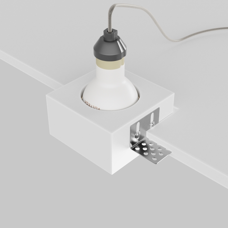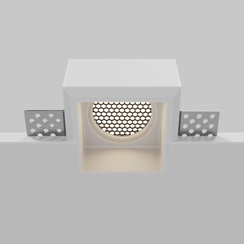 Светильник имеет квадратную форму, выполнен в чистом белом цвете, что позволяет ему легко вписаться в различные стили интерьера. Изготовленный из гипса, он обладает гладкой фактурой, что придаёт ему современный вид. Его элегантные линии и компактные размеры делают его идеальным решением для встраивания в потолок.