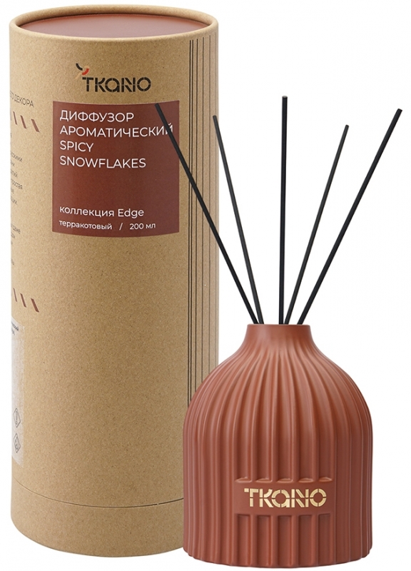 Диффузор ароматический Spicy Snowflakes терракотового цвета из коллекции Edge с дизайном, вдохновленным русскими традициями, отлично подойдет для домашнего декора и создания в интерьере уютной, расслабляющей атмосферы. Фактурные грани и округлая поверхность стеклянного флакона отсылают нас к образу купола – символу духовного подъема и стремления к совершенству. В комплект входят 10 фибровых палочек. Этот аромат идеально подходит для создания в интерьере праздничного настроения и теплой домашней атмосферы за столом. Объем: 200 мл. Время диффузии: 14-16 недель, в зависимости от количества фибровых палочек. Для создания ароматической композиции использовались отдушки из Англии. Для применения поставить емкость с ароматическим составом на ровную поверхность и аккуратно открыть ее. Вставить палочки в горловину флакона (для легкого аромата достаточно 5 палочек, для более интенсивного - от 6 до 10 палочек). Аромат раскрывается в течение 3–6 часов. Рекомендуем переворачивать палочки каждые 2–3 недели, как только аромат становится менее интенсивным. ! Установить диффузор в недоступном для детей и животных месте, вдали от источников тепла, открытого огня и раскаленных предметов. ! Избегать попадания ароматического состава на лакированные, окрашенные или глянцевые поверхности. В случае попадания жидкости на мебель или другие предметы незамедлительно уберите ее. ! Избегать контакта с кожей и глазами. ! В случае контакта с глазами немедленно промыть их большим количеством холодной воды и, если необходимо, обратиться к врачу. ! Не употреблять внутрь. При случайном проглатывании немедленно обратиться к врачу и показать этикетку с составом. ! Хранить флакон с ароматическим маслом с плотно закрытой крышкой в сухом и прохладном месте. ! Ароматическая жидкость не предназначена для ароматерапии в механических диффузорах и увлажнителях.