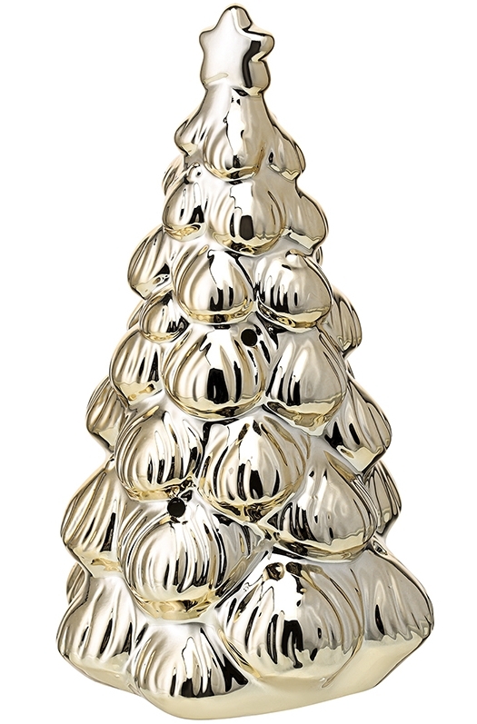 Декор в виде ёлочки выполнен из высококачественного фарфора, что придаёт ему не только элегантный вид, но и долговечность. Золотистый цвет символизирует роскошь и изысканность, а гладкая фактура создает эффект свечения, напоминая о теплых воспоминаниях, связанных с зимними праздниками. Встроенная подсветка добавляет живости, подчеркивая детали и создавая уютную атмосферу в вашем доме.