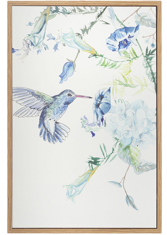 На постере изображен колибри, парящий среди нежных цветков, что символизирует свободу и красоту природы. Такой сюжет вдохновляет на мечты и наполняет пространство позитивной энергией.