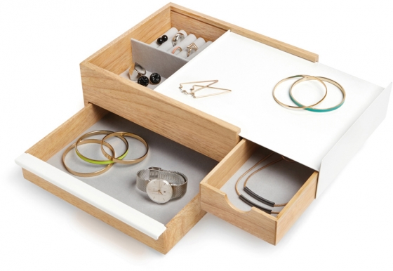 Большая деревянная шкатулка для украшений с несколькими отделениям. Верхнее отделение оснащено кармашками для колец или запонок и небольшими ящичками для прочих мелочей. Нижняя часть предназначена для хранения более крупных аксессуаров: часов или браслетов. Благородное сочетание натурального дерева и белого металла делают шкатулку ярким представителем скандинавского модернизма.