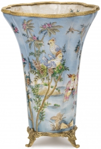 Основной материал: терракота. Отделка: ручная работа с многоцветным оформлением. Ощущения: приятно тяжелая, с гладкой, но не глянцевой поверхностью, чувствуется теплота натурального материала, что делает каждую вазу уникальной.