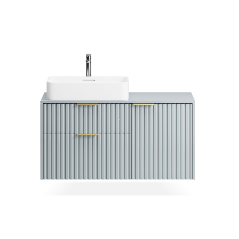 Компактные модели с двумя выдвижными ящиками и секцией с полками гармонично сочетаются с линейкой накладных раковин большинства производителей.