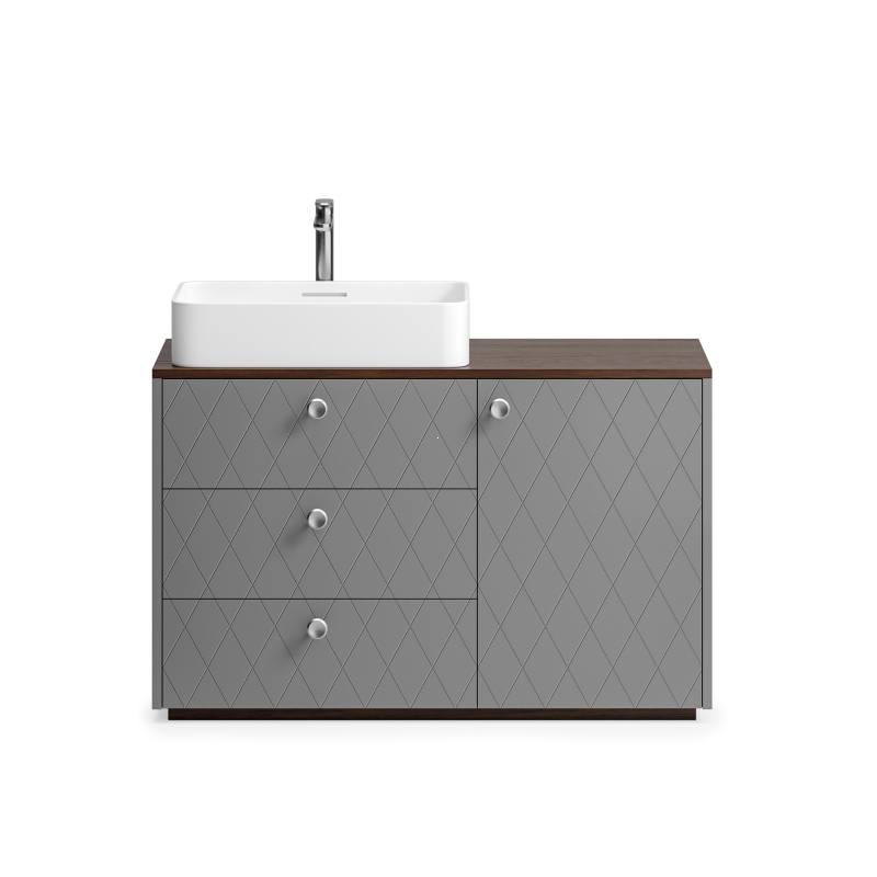 Напольные модели с двумя или тремя выдвижными ящиками и секциями с полками гармонично сочетаются с линейкой накладных раковин большинства производителей.